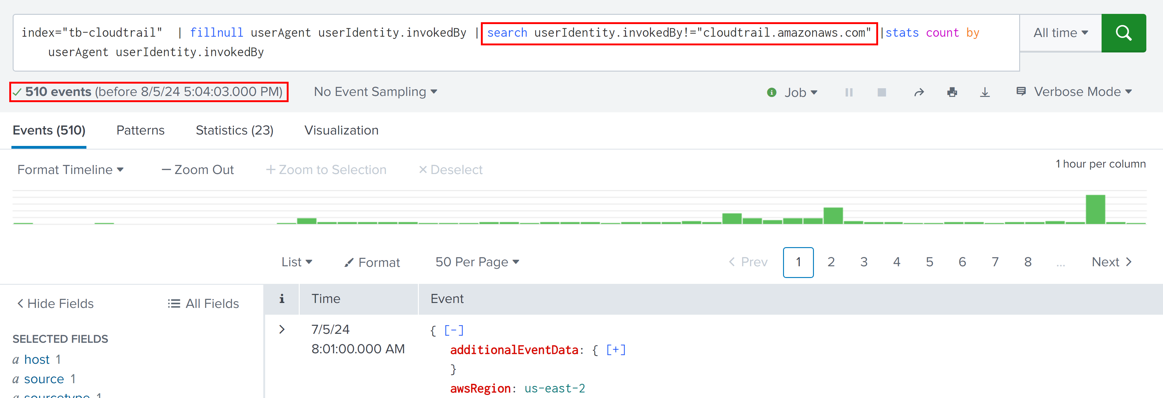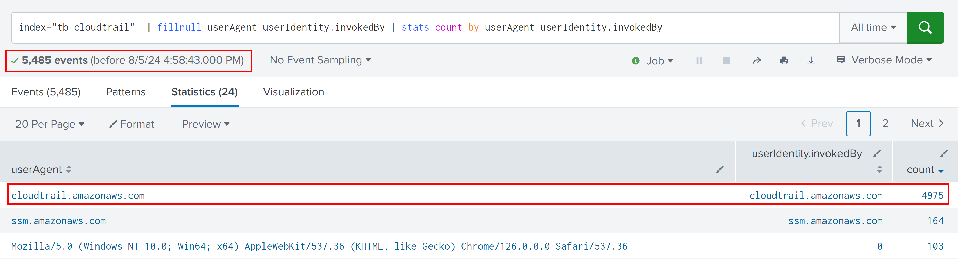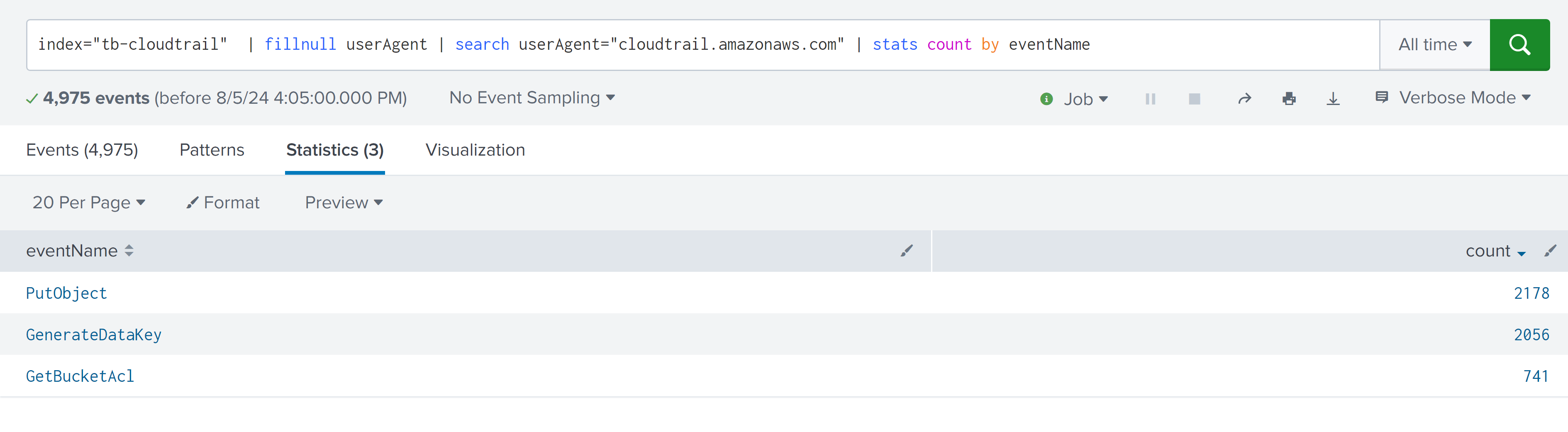 index="tb-cloudtrail" | fillnull userAgent | search userAgent="cloudtrail.amazonaws.com" | stats count by eventName