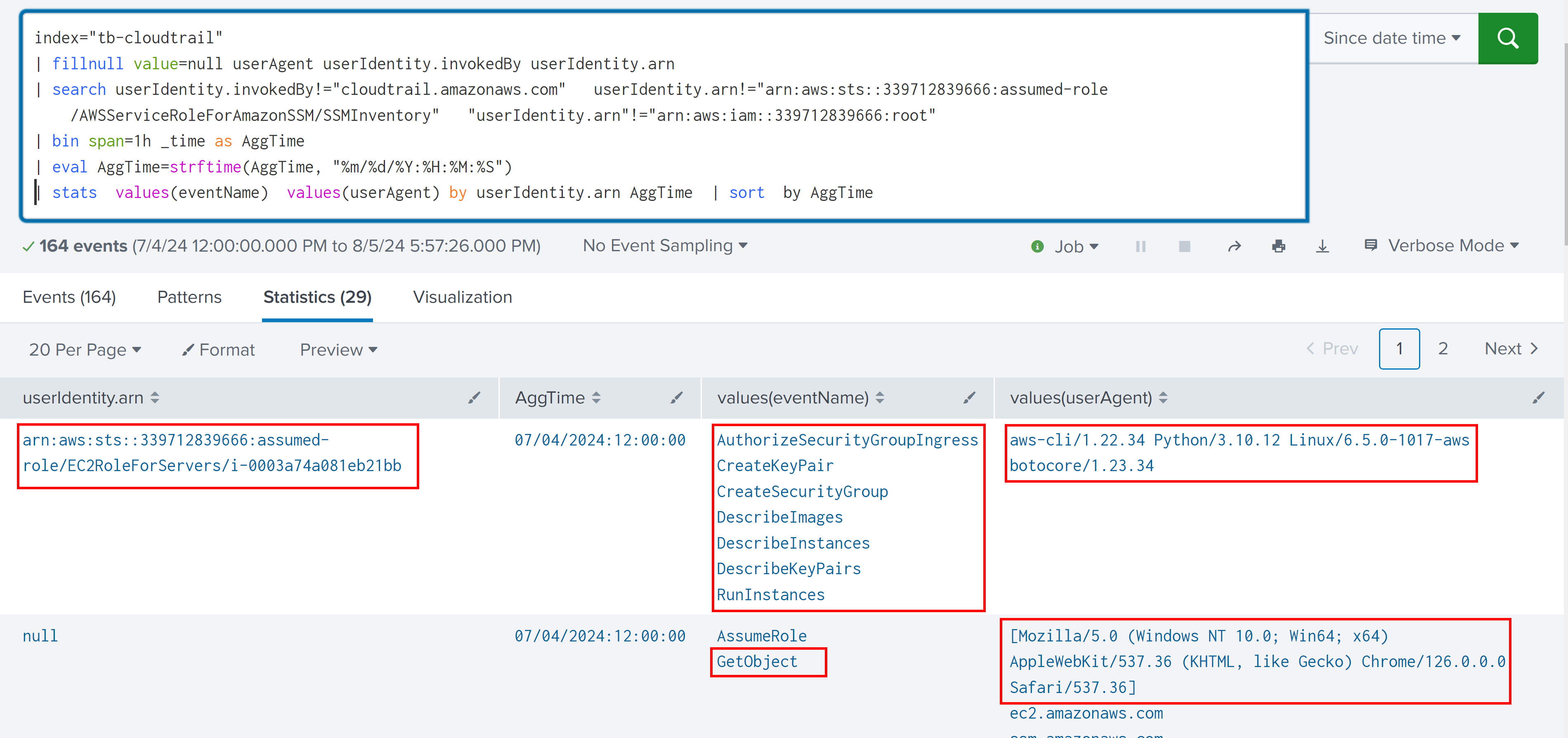 | stats values(eventName) values(userAgent) by userIdentity.arn AggTime | sort by AggTime
