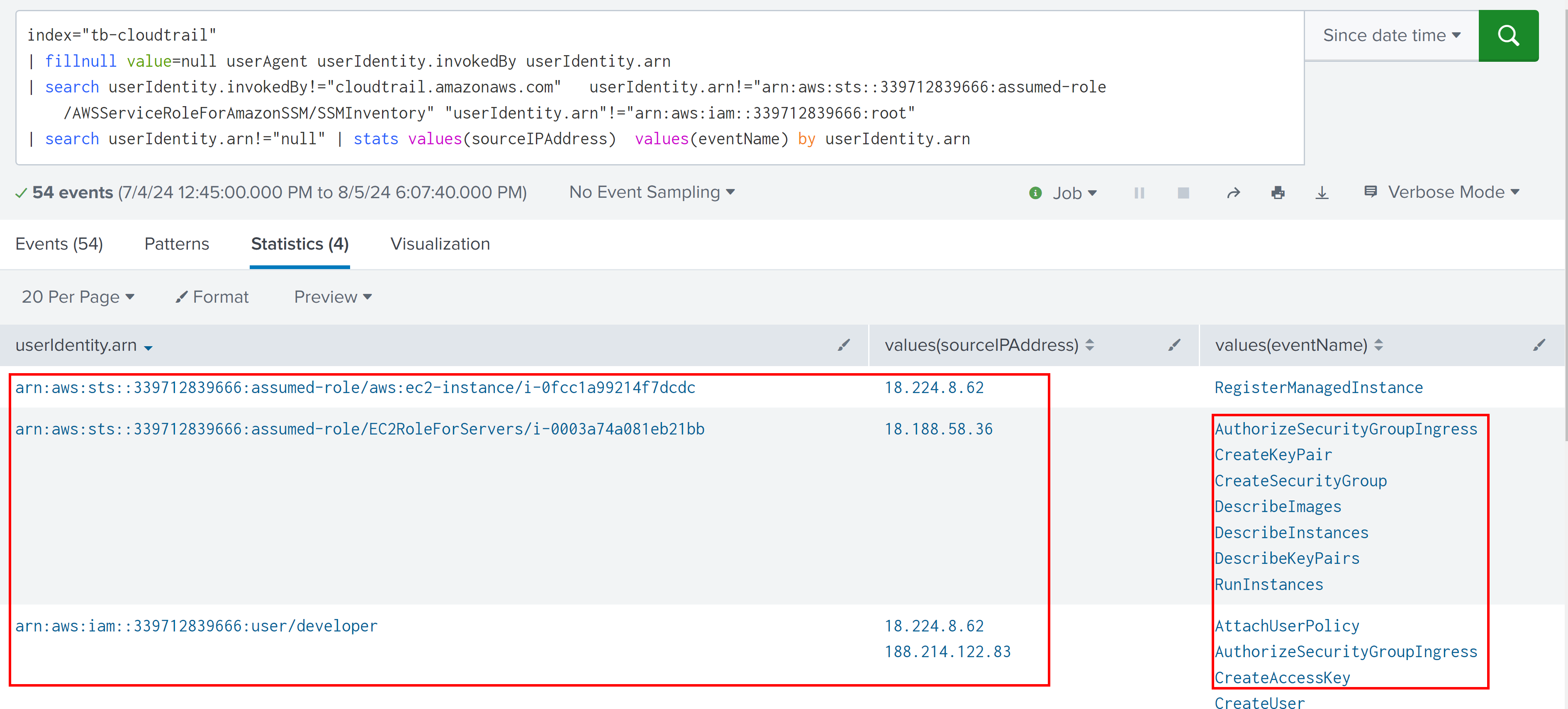 Excluding null also now shows that there are total three ARN we identified out of which EC2RoleForServers we already aware of, the developer user is bit suspicious as it using the ip same as aws:ec2-instance/i-0fcc1a99214f7dcdc and performing events like CreateUser, CreateAccessKey which can be used for persistence.