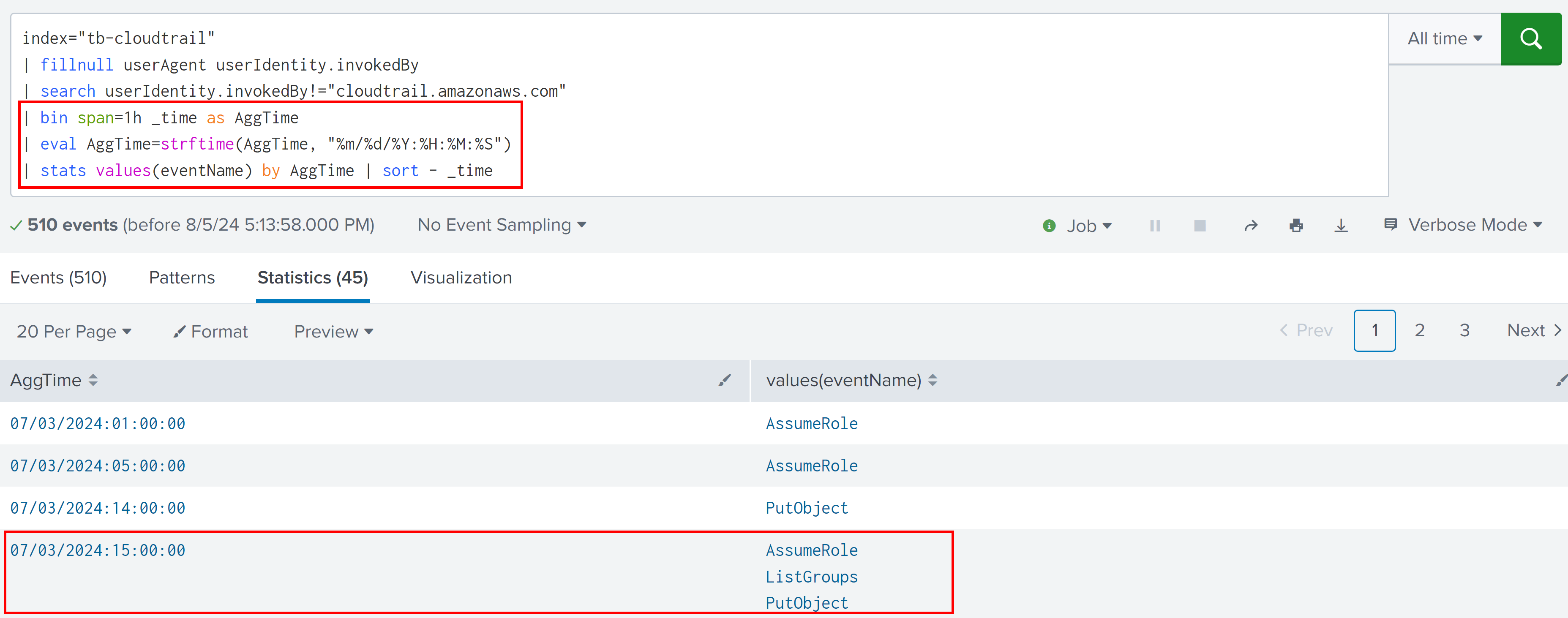 We have grouped events based on hours and it can help us to identify which specific hour or period to target for further analysis. but there are lot of repetitive task like PutObject, ListGroups etc, it can either be AWS service logs or attacker using some automated script or tools [ But it’s very less likely that it will be attacker because performing same task multiple time will generate lot of evidence in logs ]