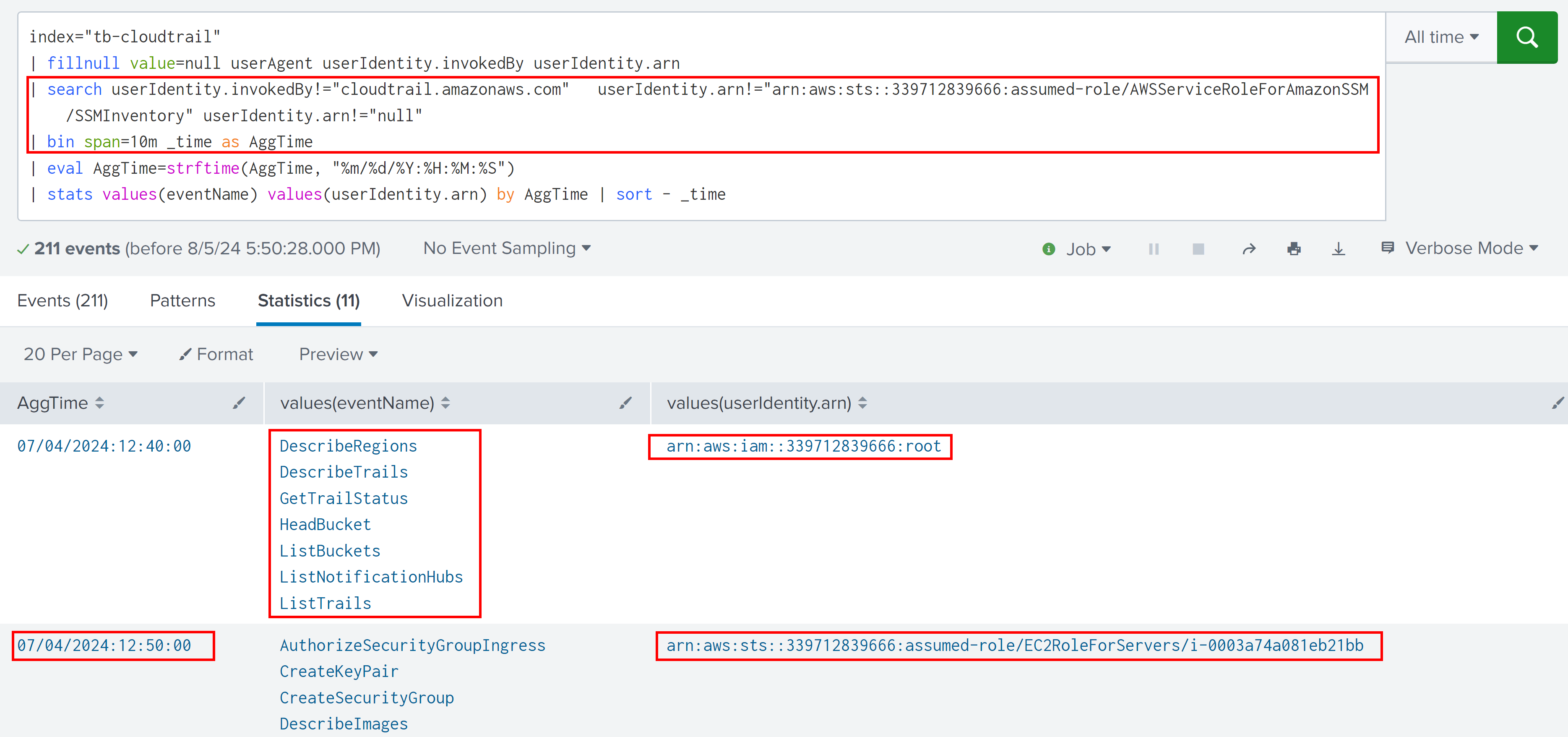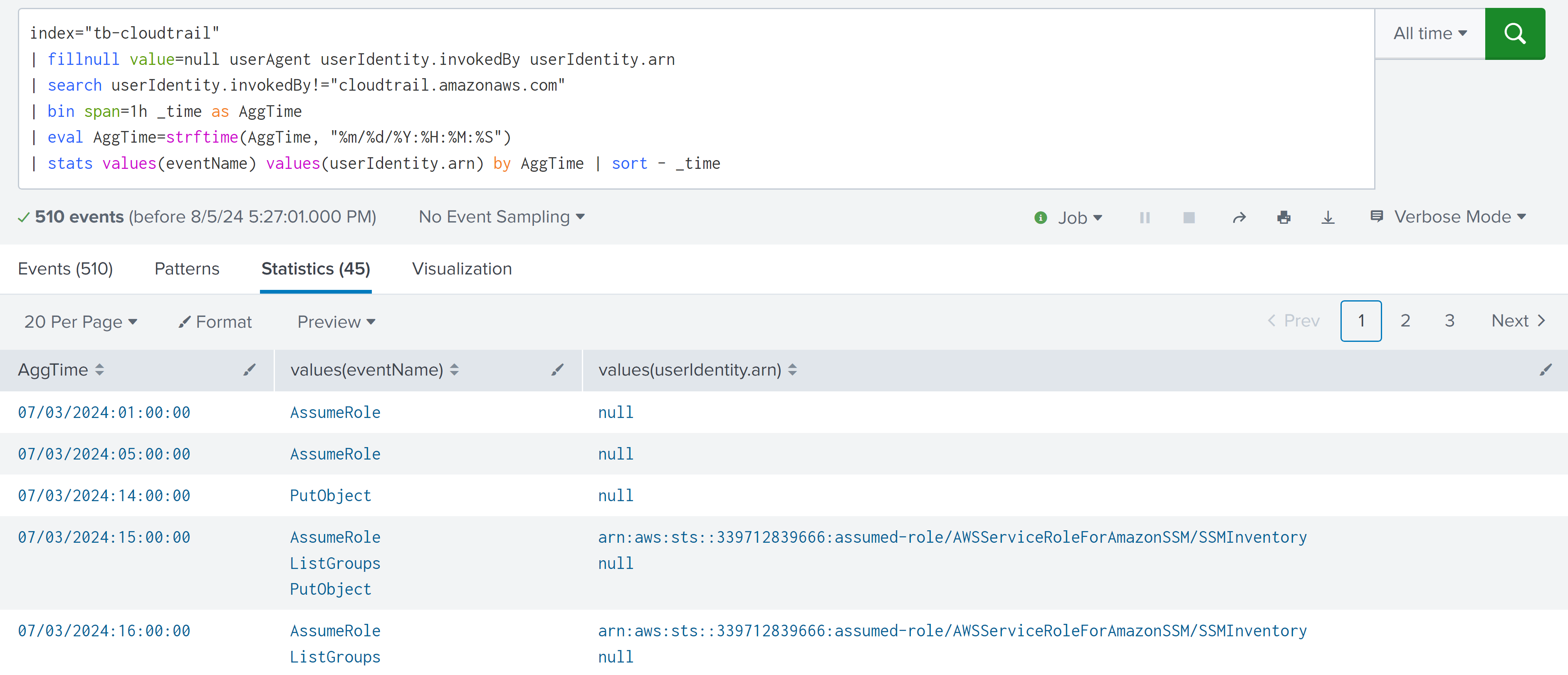 | stats values(eventName) values(userIdentity.arn) by AggTime | sort - _time