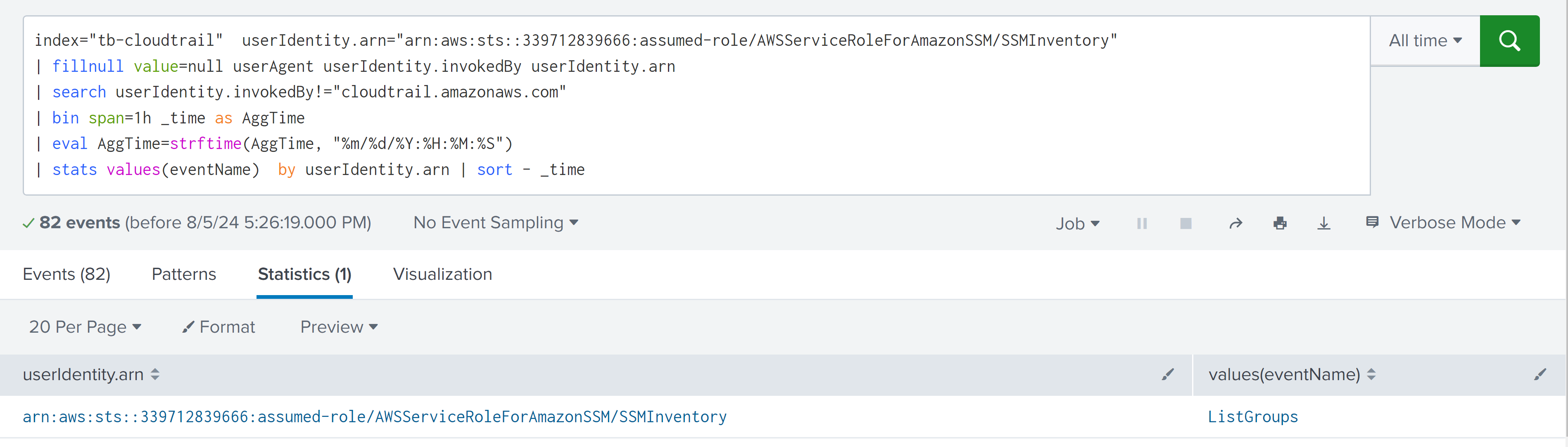 index="tb-cloudtrail" userIdentity.arn="arn:aws:sts::339712839666:assumed-role/AWSServiceRoleForAmazonSSM/SSMInventory"