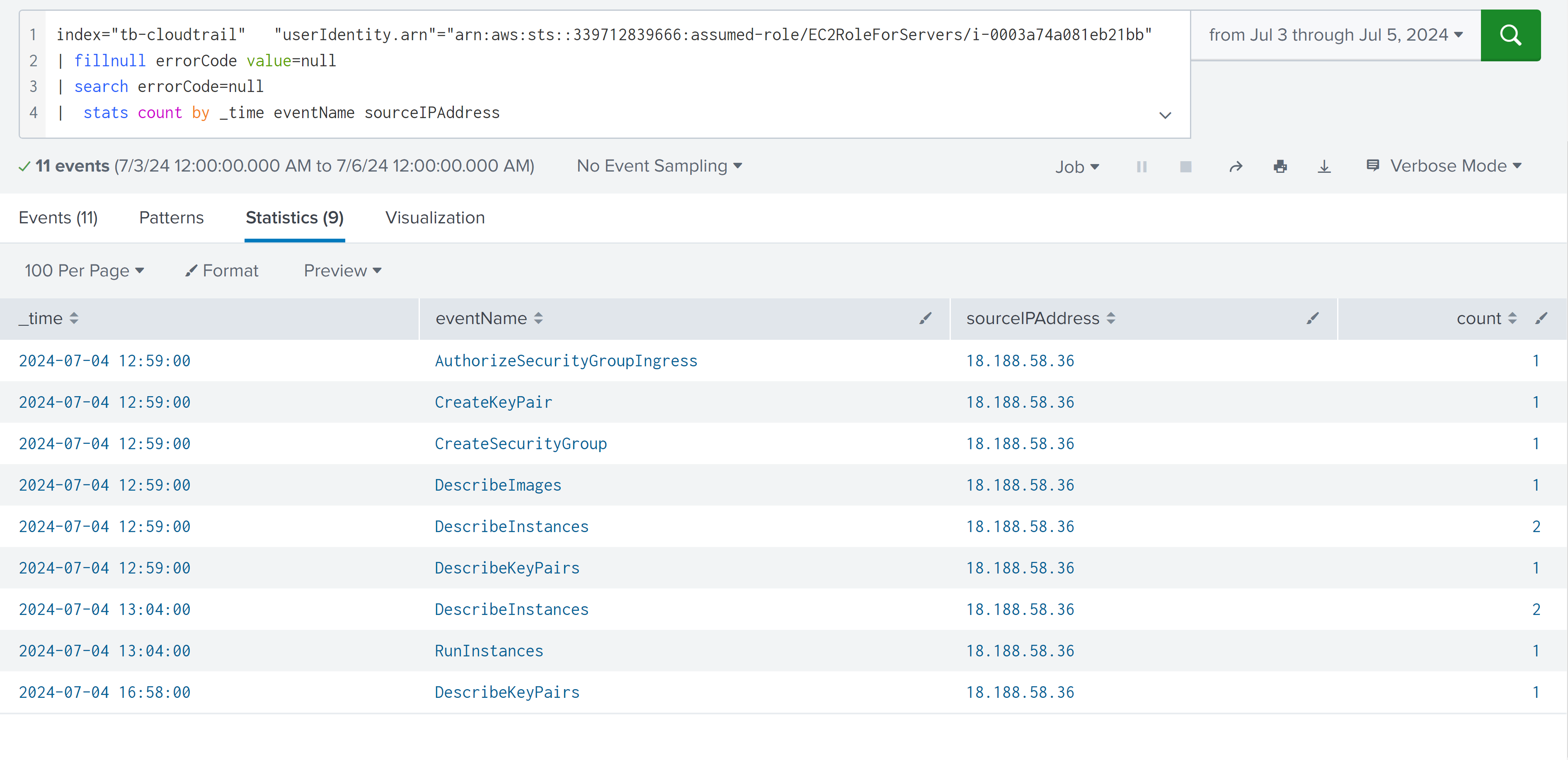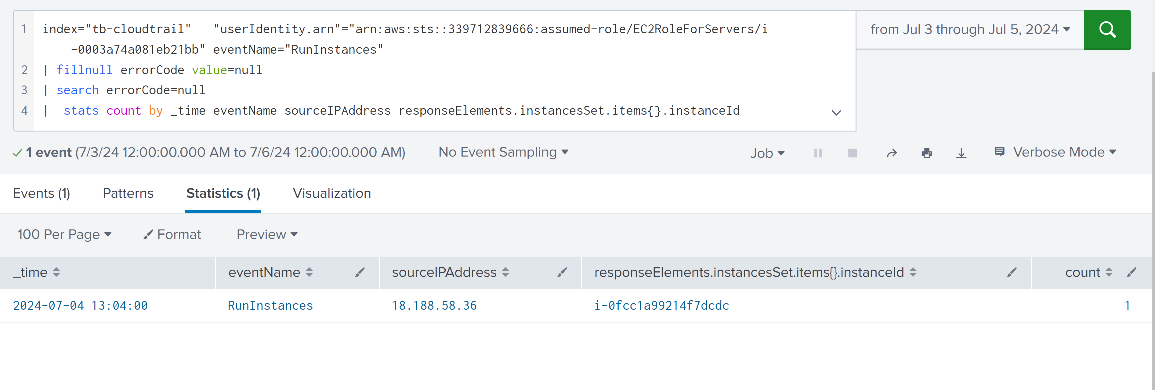 index="tb-cloudtrail" "userIdentity.arn"="arn:aws:sts::339712839666:assumed-role/EC2RoleForServers/i-0003a74a081eb21bb" eventName="RunInstances"