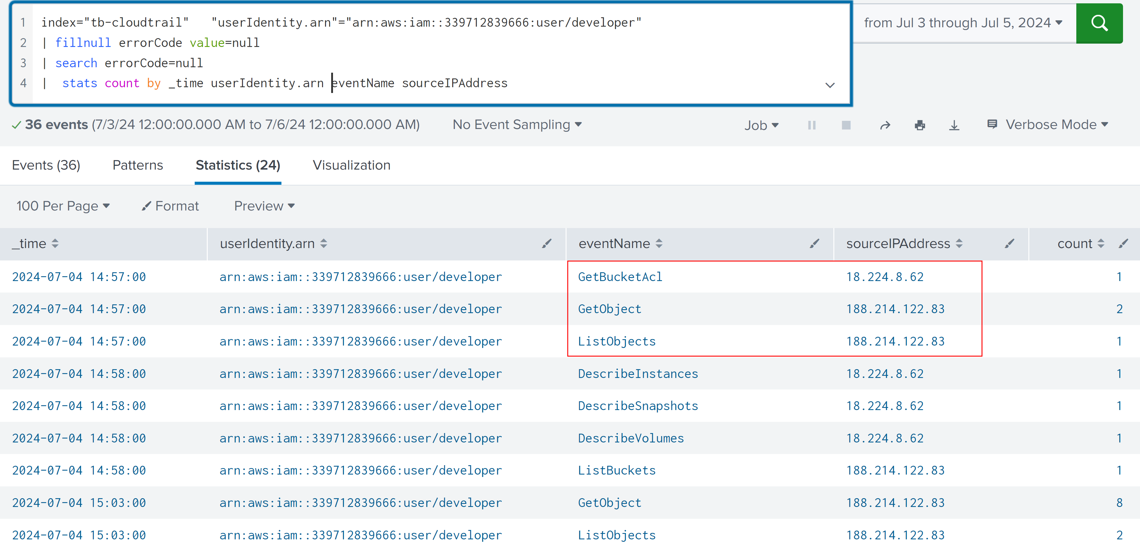 index="tb-cloudtrail" "userIdentity.arn"="arn:aws:iam::339712839666:user/developer"