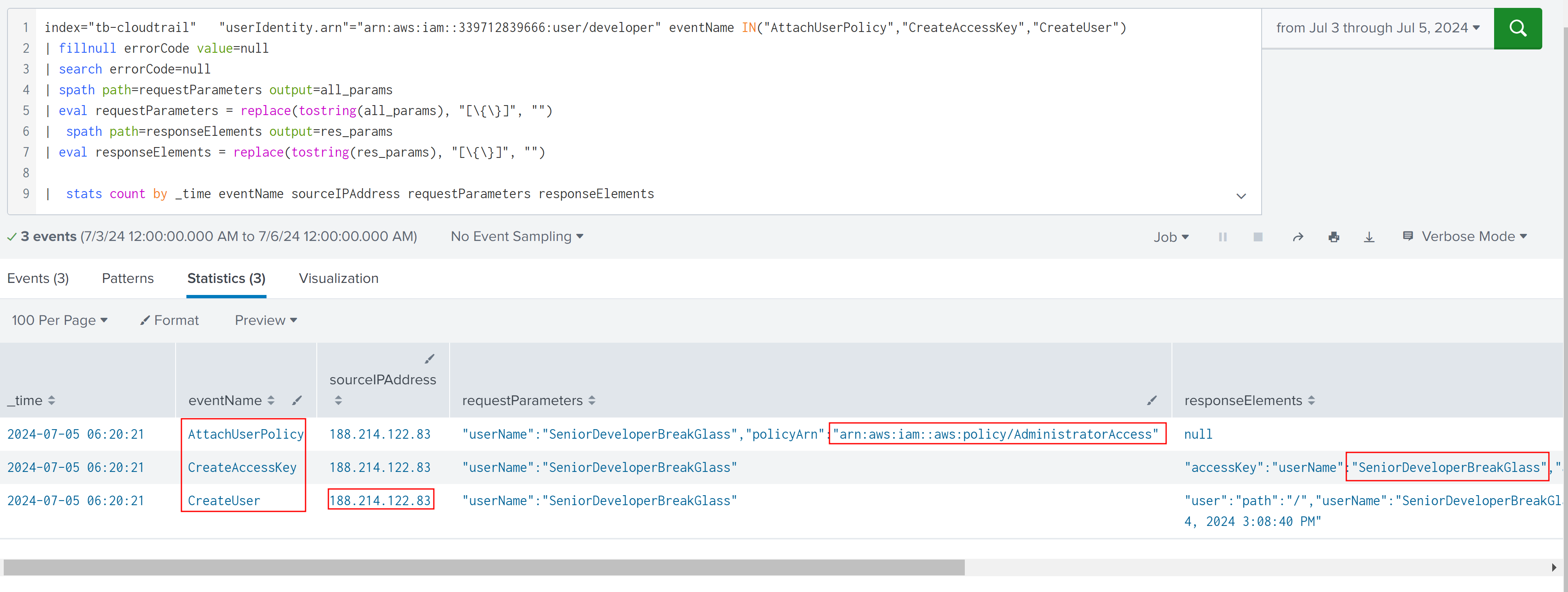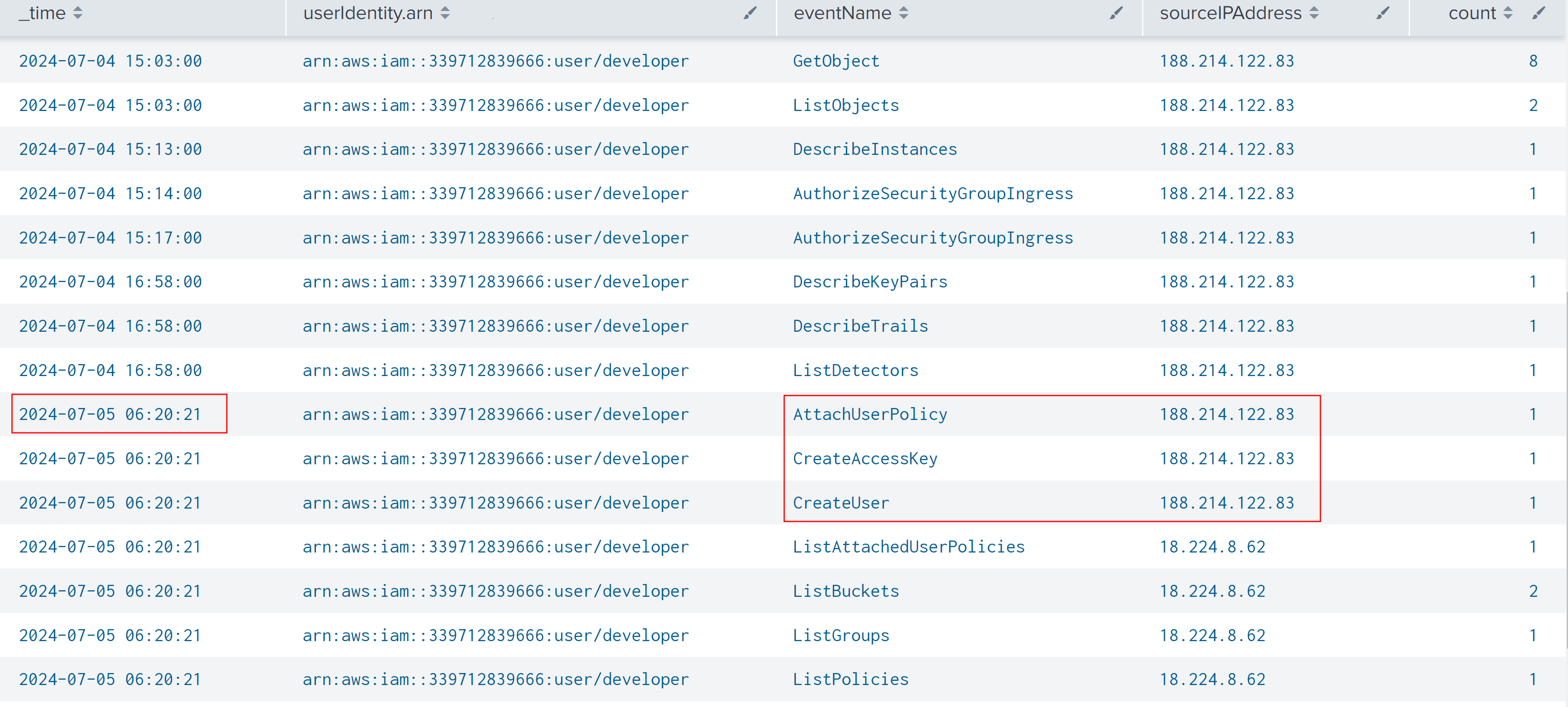 index="tb-cloudtrail" "userIdentity.arn"="arn:aws:iam::339712839666:user/developer" eventName IN("AttachUserPolicy","CreateAccessKey","CreateUser")