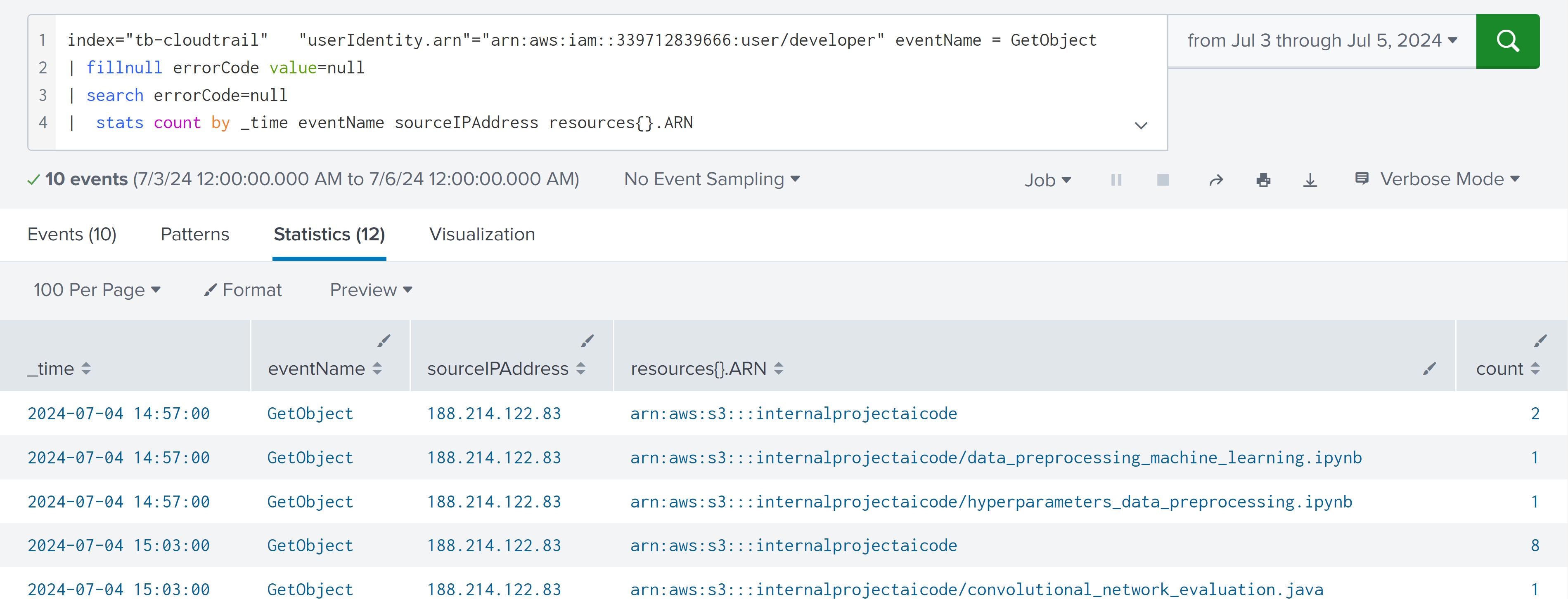 index="tb-cloudtrail" "userIdentity.arn"="arn:aws:iam::339712839666:user/developer" eventName = GetObject