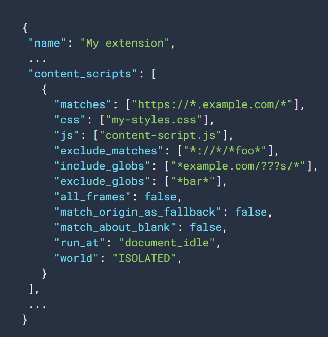 The background key in manifest.json file is used to specify scripts that can handle browser events like closing a tab, new page, etc. content_scripts can’t access Webextension API, but background scripts can help. Therefore, scripts added to content_scripts key can communicate with background scripts to perform tasks.