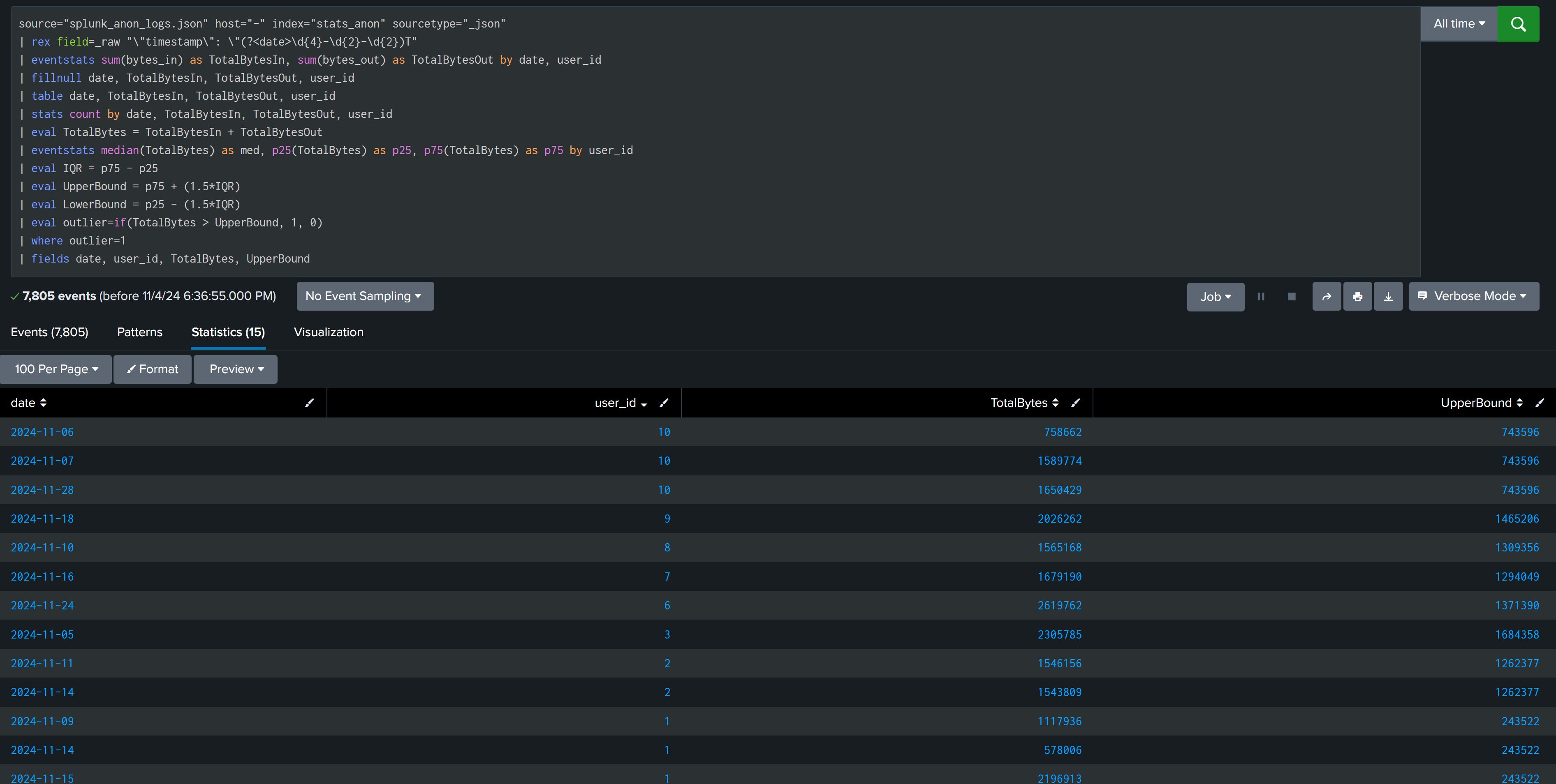 We want to find outlier based on total bytes [ in and out both ]. Using eventstats calculate the sum of bytes based on user_id per day. After that median, First & Third quartile is calculated for TotalBytes of each user_id.