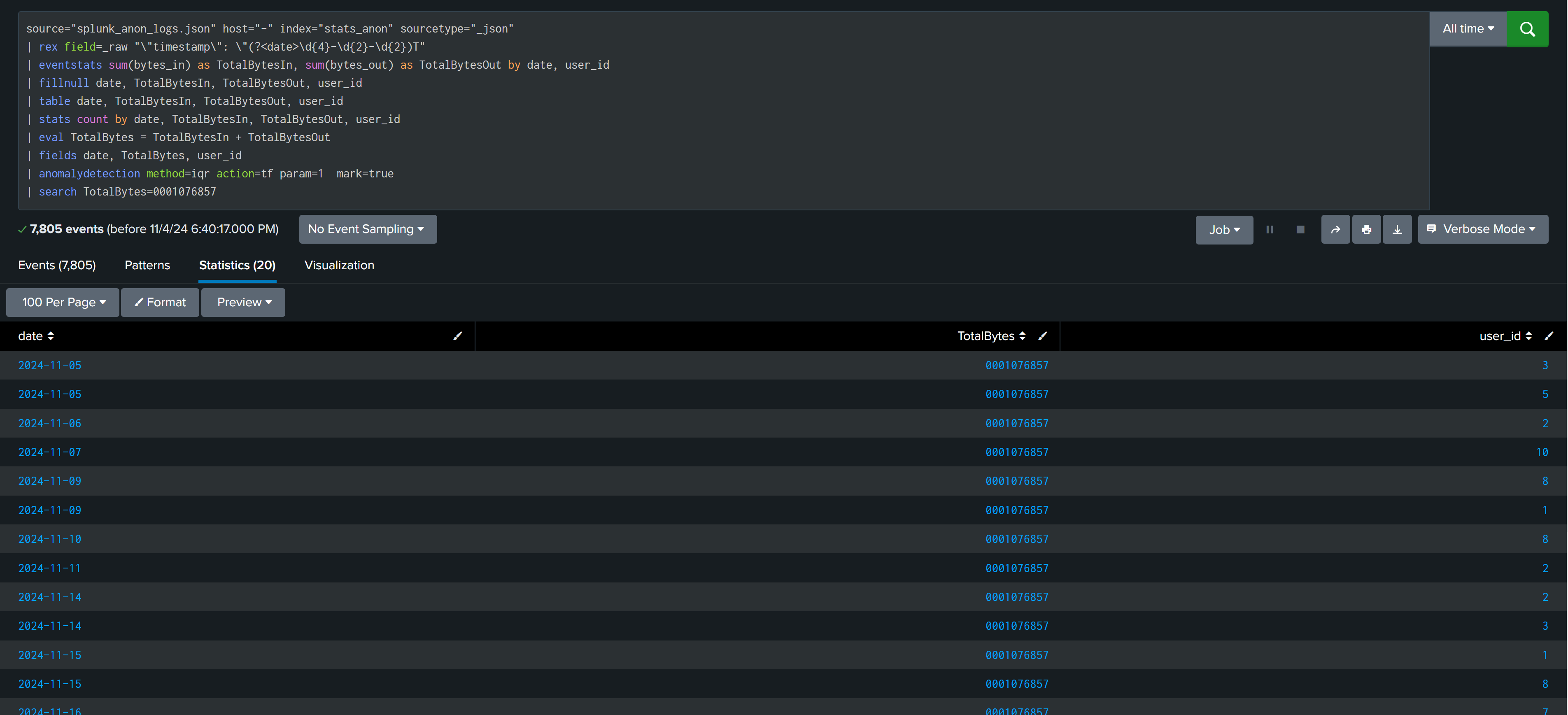 | stats count by date, TotalBytesIn, TotalBytesOut, user_id