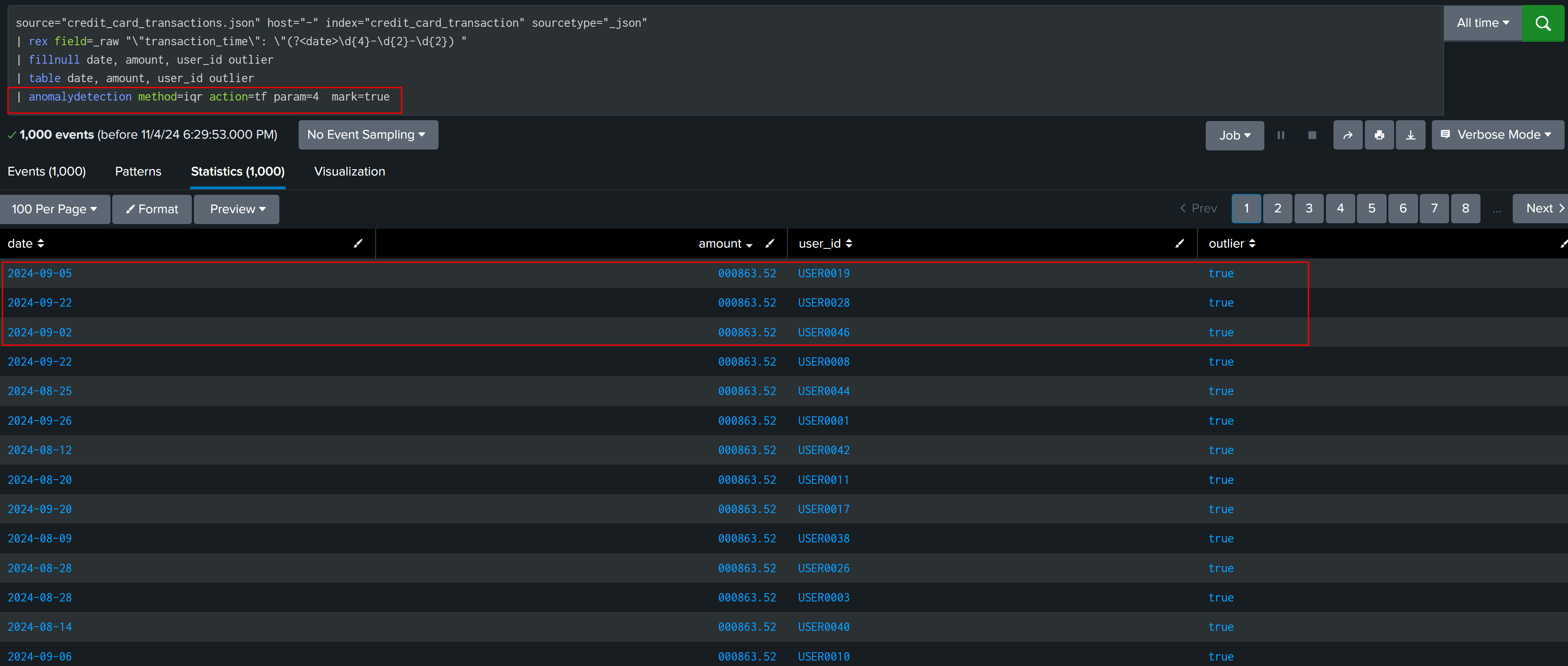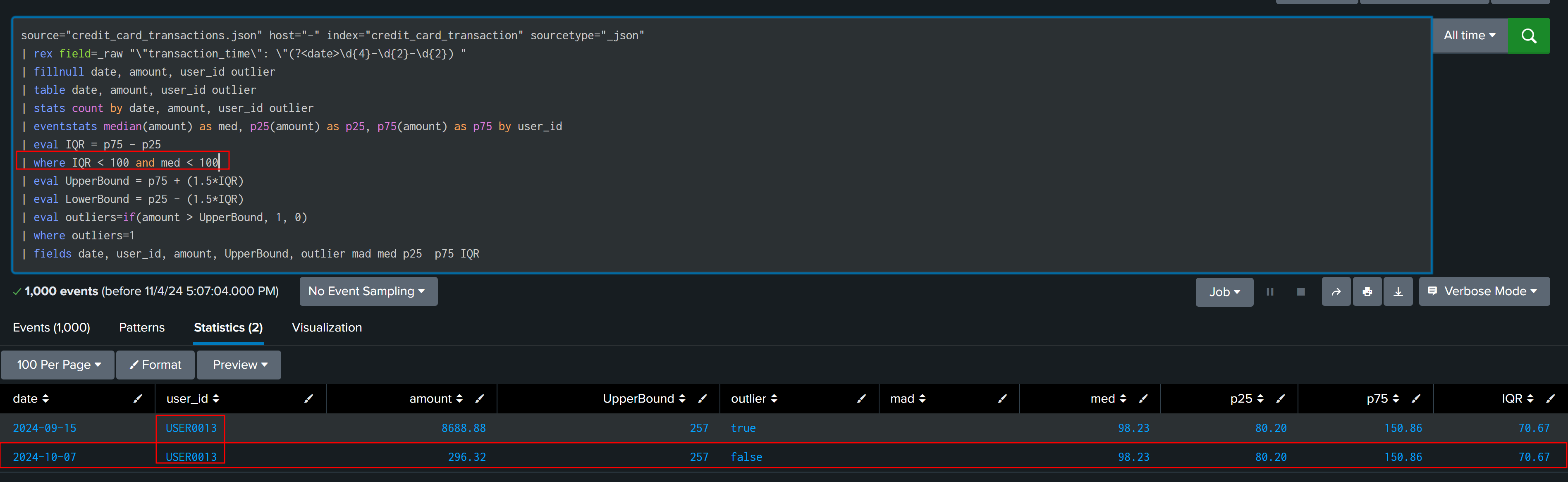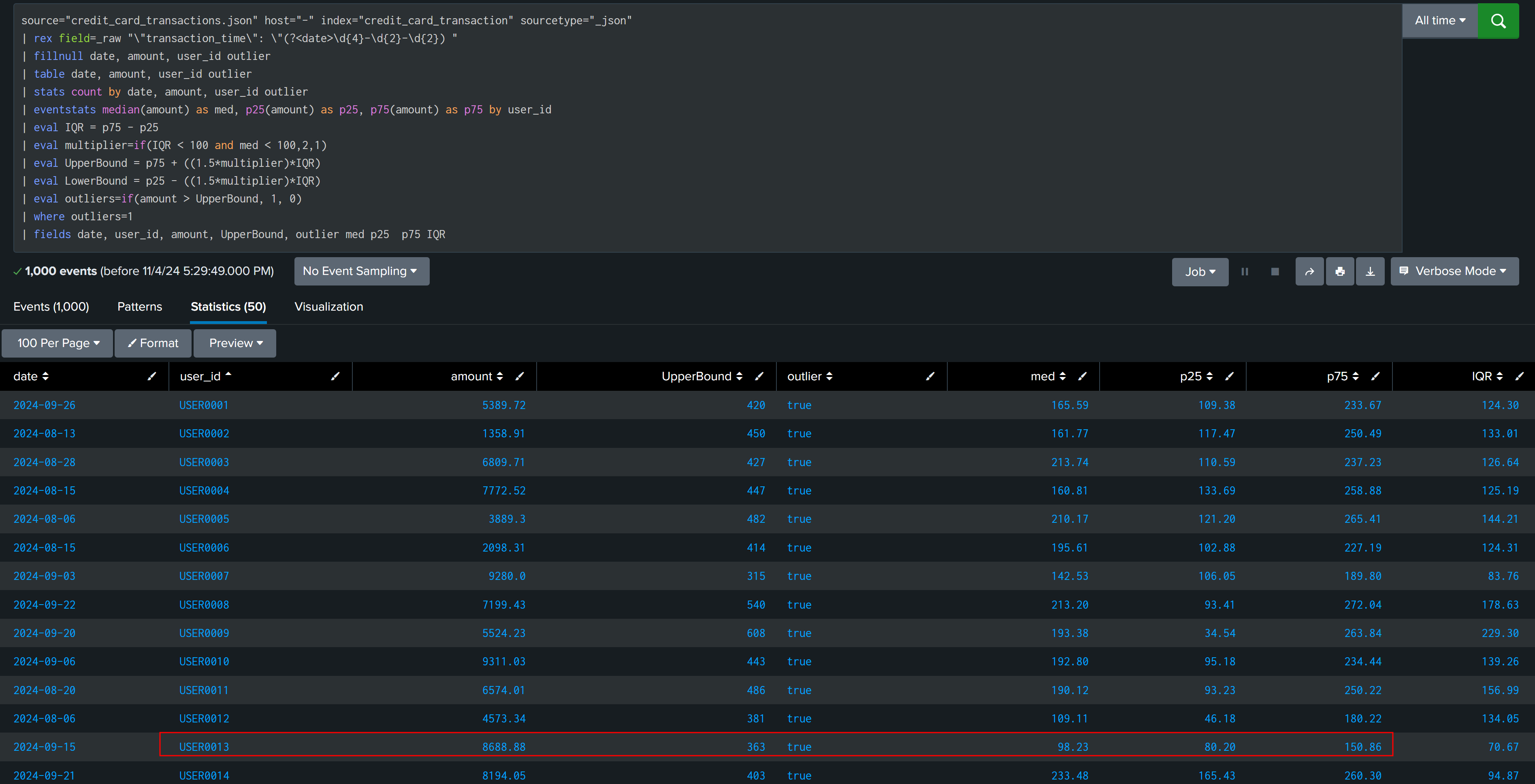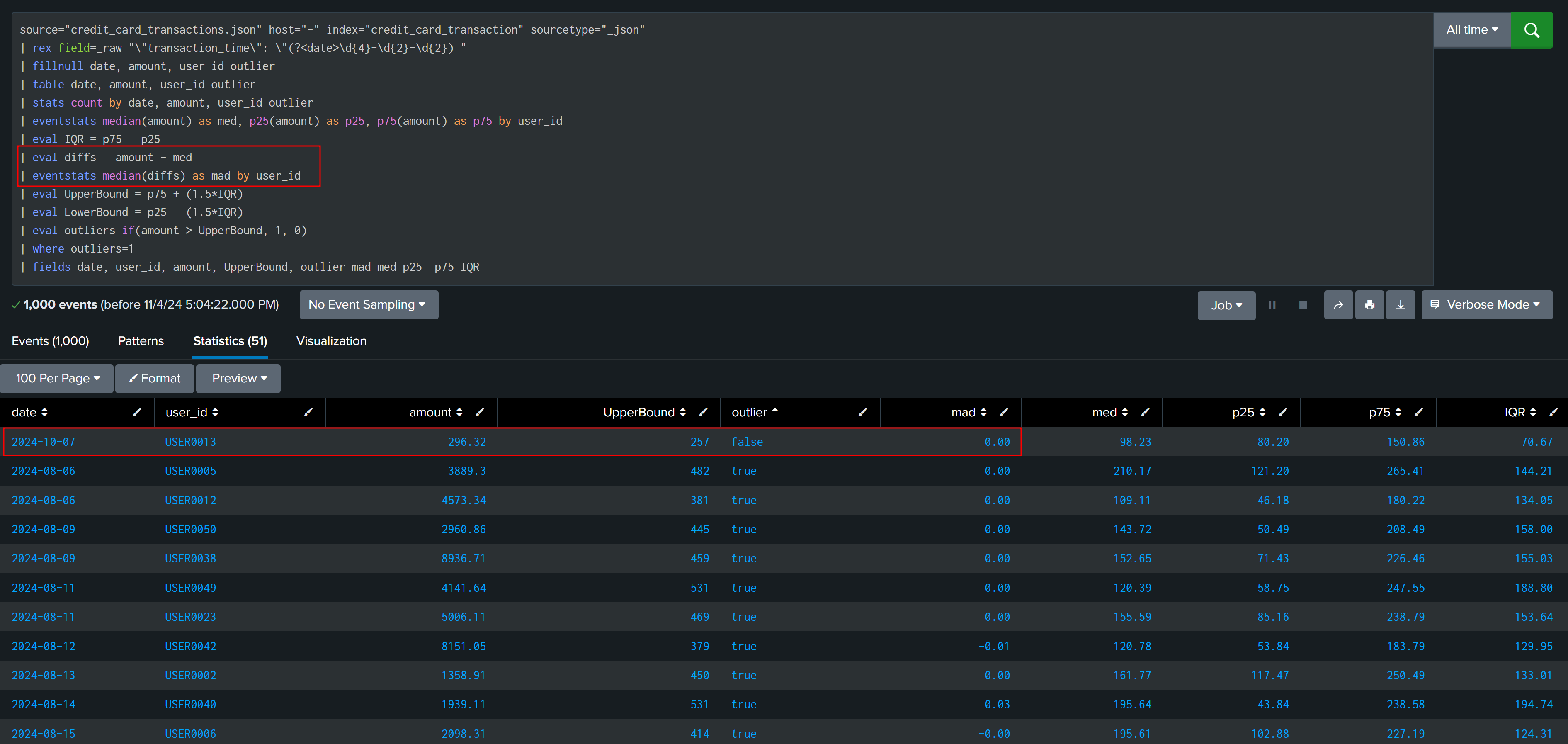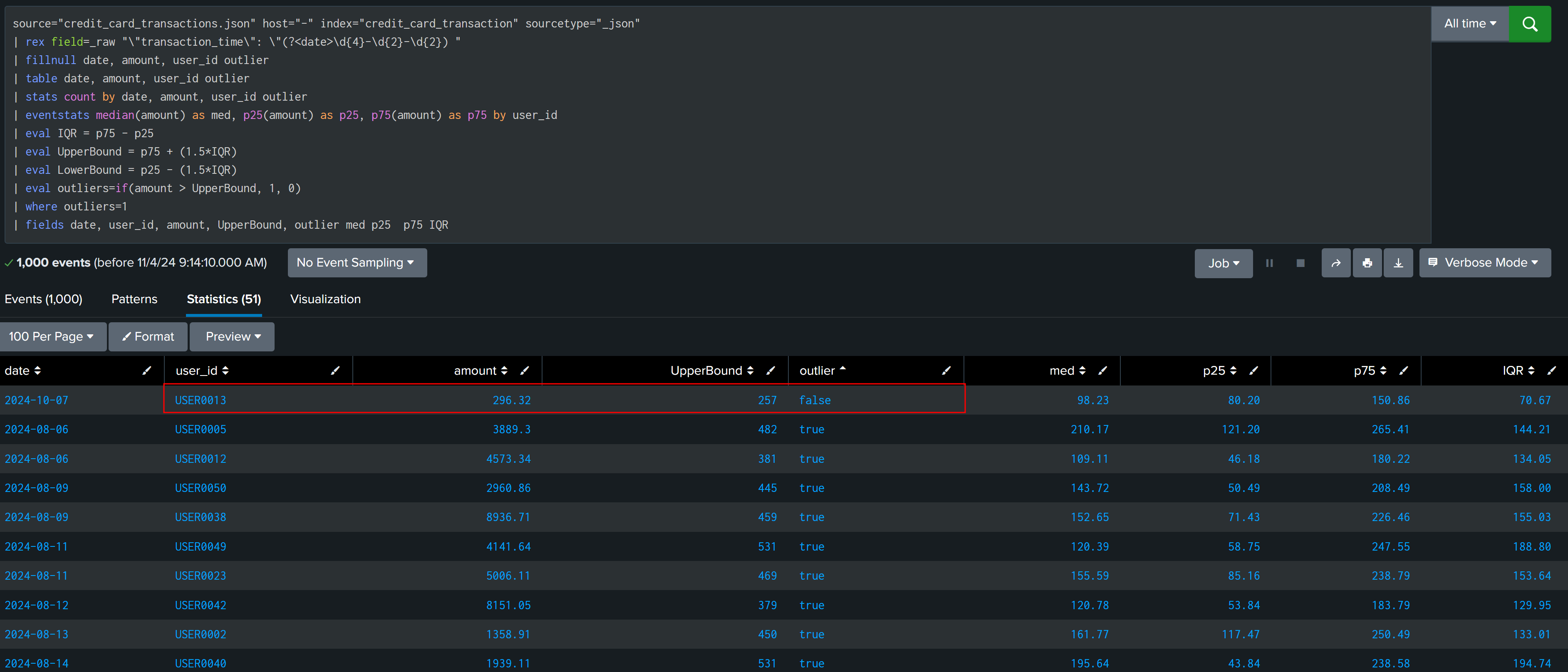 | fields date, user_id, amount, UpperBound, outlier med p25 p75 IQR